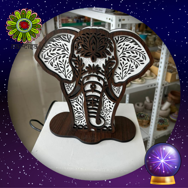 Diseñada en capas de madera calada, esta pieza resalta la figura del elefante, símbolo universal de fortaleza, protección y buena fortuna.