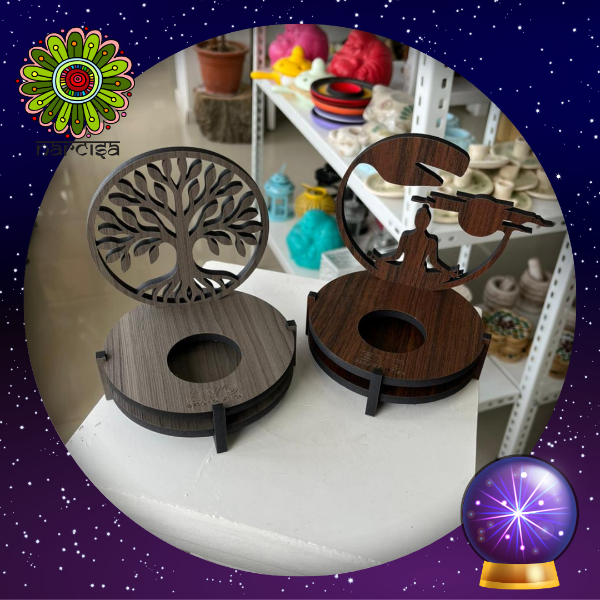Fabricado en madera, firme y de corte limpio, este soporte combina calidez, diseño y un toque energético que transforma cualquier rincón.