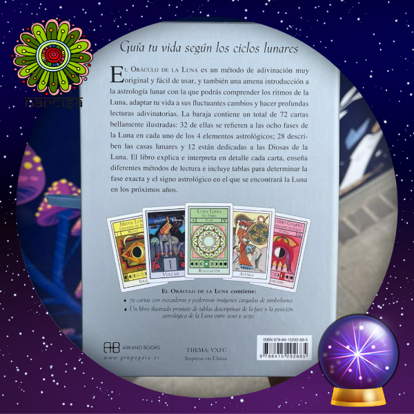 El oráculo de la luna es un método de adivinación muy original y fácil de usar, y también una amena introducción a la astrología lunar con la que podrás comprender los ritmos de la Luna, adaptar tu vida a sus fluctuantes cambios y hacer profundas lecturas adivinatorias. La baraja contiene un total de 72 cartas bellamente ilustradas: 32 de ellas se refieren a las ocho fases de la Luna en cada uno de los 4 elementos astrológicos; 28 describen las casas lunares y 12 están dedicadas a las Diosas de la Luna. El libro explica e interpreta en detalle cada carta, enseña diferentes métodos de lectura e incluye tablas para determinar la fase exacta y el signo astrológico en el que se encontrará la Luna en los próximos años.
