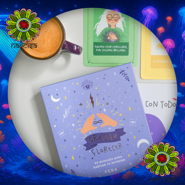 Este oráculo contiene 44 cartas ilustradas con frases para florecer. Viajera, Hechicera , Renacer o Despertar son las cuatro secciones en las que está dividido.