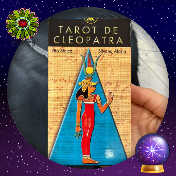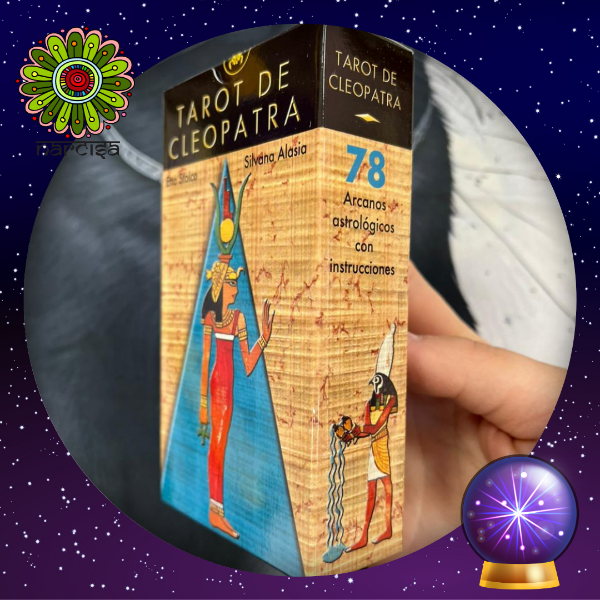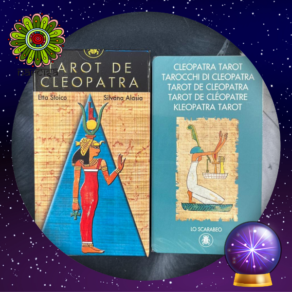 Baraja dedicada a la última reina egipcia, Cleopatra, famosa por su extraordinaria cultura e inteligencia, así como por su exótica belleza. De la época de Cleopatra proviene el Zodíaco de Dendderah, un bajorrelieve esculpido en el techo del templo dedicado a la diosa Hathor en Denderah. Esta obra, que constituye el mapa más completo del cielo antiguo, demuestra la relación entre la astrología egipcia y la greco-babilónica. EL Tarot de Cleopatra sintetiza la cultura religiosa y astrológica de esa época, reuniendo 78 divinidades egipcias subdivididad en grupos de poder. Los Arcanos mayores representan 22 divinidades superiores cuyos respectivos campos de acción se relacionan con aquellos de los 22 Triunfos del Tarot. Las Figuras de Corte son 16 divinidades de un rango apenas inferior de los Arcanos Mayores. Las Cartas numéricas del 2 al 10 son los 36 Decanos, es decir los espíritus de los meses representados en el Templo de Denderah. Por últimos, los cuatros Ases simbolizan las tres estaciones tradicionales del calendario egipcio y los días cruciales de Sopdet, la ascensión de Sothis, es decir, de la estrella de Sirio: un período que coincidiía con el comienzo de las benéficas crecidas del Nilo.